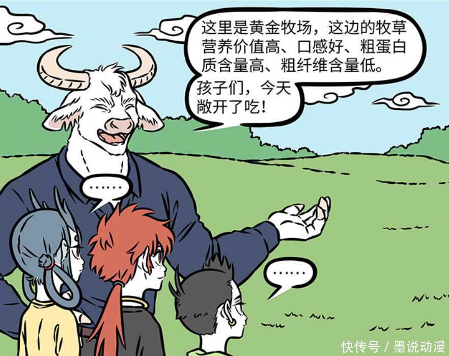 谁能想到,牛魔王带着孩子们来到黄金牧场,这里的牧草营养价值高、口感好、粗蛋白质等等含量高。牛魔王让红孩儿、哪吒和龙女敞开的吃,可是他们是一点都不感兴趣。如果是敖烈过来,或许会有点想吃,可是孩子们对牧草提不起任何兴趣。